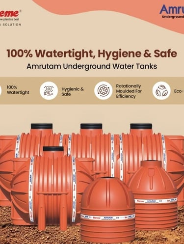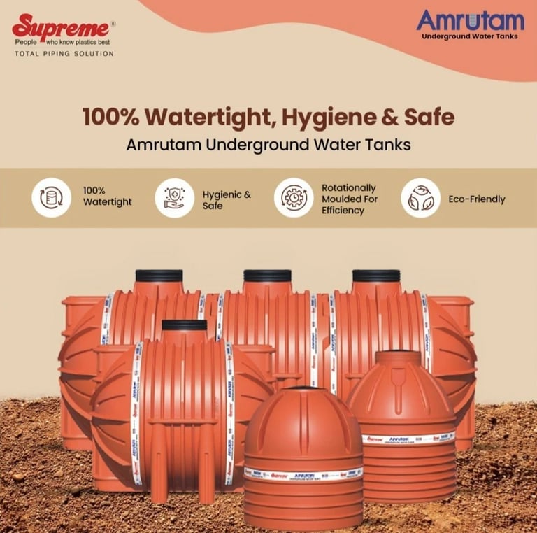 The Supreme Industries ltd., is an acknowledged leader of India's plastic industry. It is credited with pioneering several path breaking products and has been a torch bearer in the transition from conventional to advanced plastic piping products in the country. Its customer centric approach fuels its research for designing unmatched quality products to meet the aspirations of its quality conscious customers. The innovative product portfolio offered by Supreme is extensive in range and application and comprises variety of pipes and vast spectrum of fittings totaling over 8000 diverse products. Supreme offers an exhaustive range of quality water storage tanks. This includes loft tanks and overhead water storage tanks in different varieties. Recently we have introduced readymade underground water storage tanks under the brand name of 'Amrutam'. Thus Supreme caters almost every requirement of water storage. Amrutam ready to use plastic tanks are manufactured using the best quality virgin raw material and are equipped with many outstanding features that makes these tanks superior substitute to the conventional concrete and masonry tanks. Besides cumbersome and time consuming construction, repeated maintenance and uncertain life span the conventional tanks are associated with many other problems like crack formation, seepage, root penetration etc. On the other side Amrutam tanks are completely free from these problems and offers many great additional features.