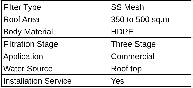 This open ended filter has auto flush out feature enabling self cleaning with unique working principle. FL-500 is suitable for 350 to 500 sq.m rooftop area.